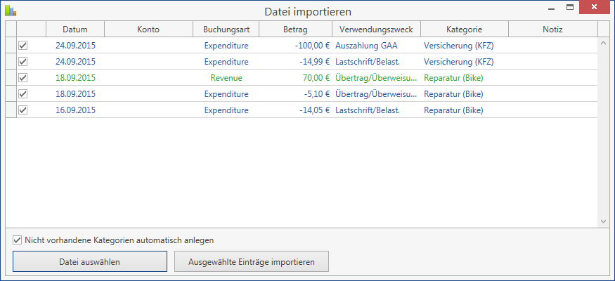 Zu deiner Frage bzgl. dem Importieren von Kategorien kann ich dir auf jeden Fall weiterhelfen. Wenn man den Haken bei “Nicht vorhandene Kategorien automatisch eintragen” setzt, dann wird gemäß dem zugewiesenen Kategorienfeld eine entsprechende Kategorie angelegt. Bei dir wird es aber keine entsprechende Zuweisung geben. Dies ist bei Kontoauszügen aber nichts ungewöhnliches, dort gibt es im Export meist keine separate Spalte für Kategorien. Das ist auch der Grund, warum bei dir keine Kategorien erzeugt werden.